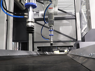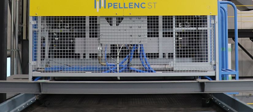 光学式選別機は、飲料用空き容器が高速コンベアを移動して行き、コンベア上部に設置された光学式センサー(カメラ)で、ペットボトルを認識し、選択したペットボトルを、エアーノズルで吹き飛ばすシステムを採用しております。吹き飛ばされたペットボトルは、圧縮梱包機へとコンベアで運ばれます。